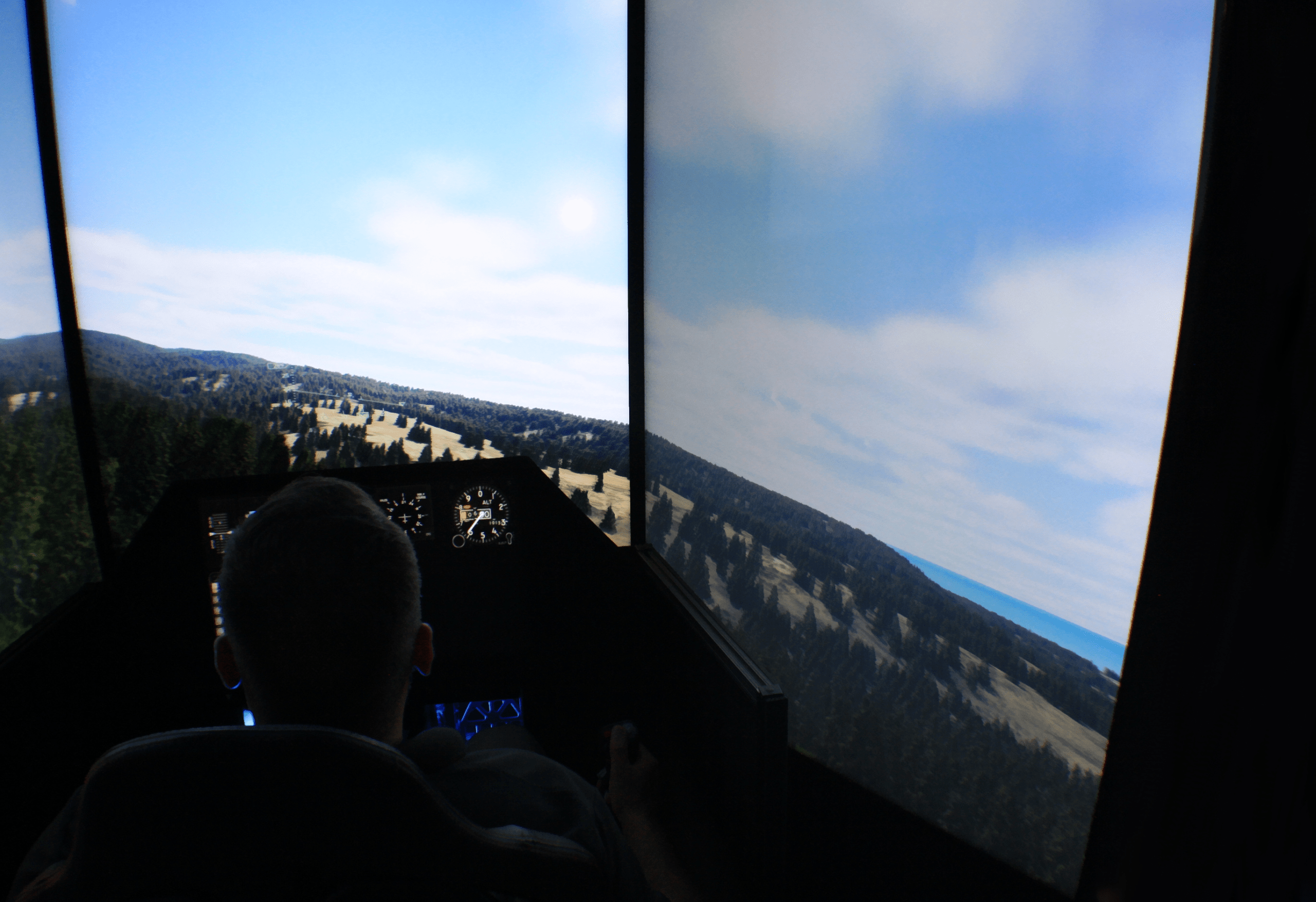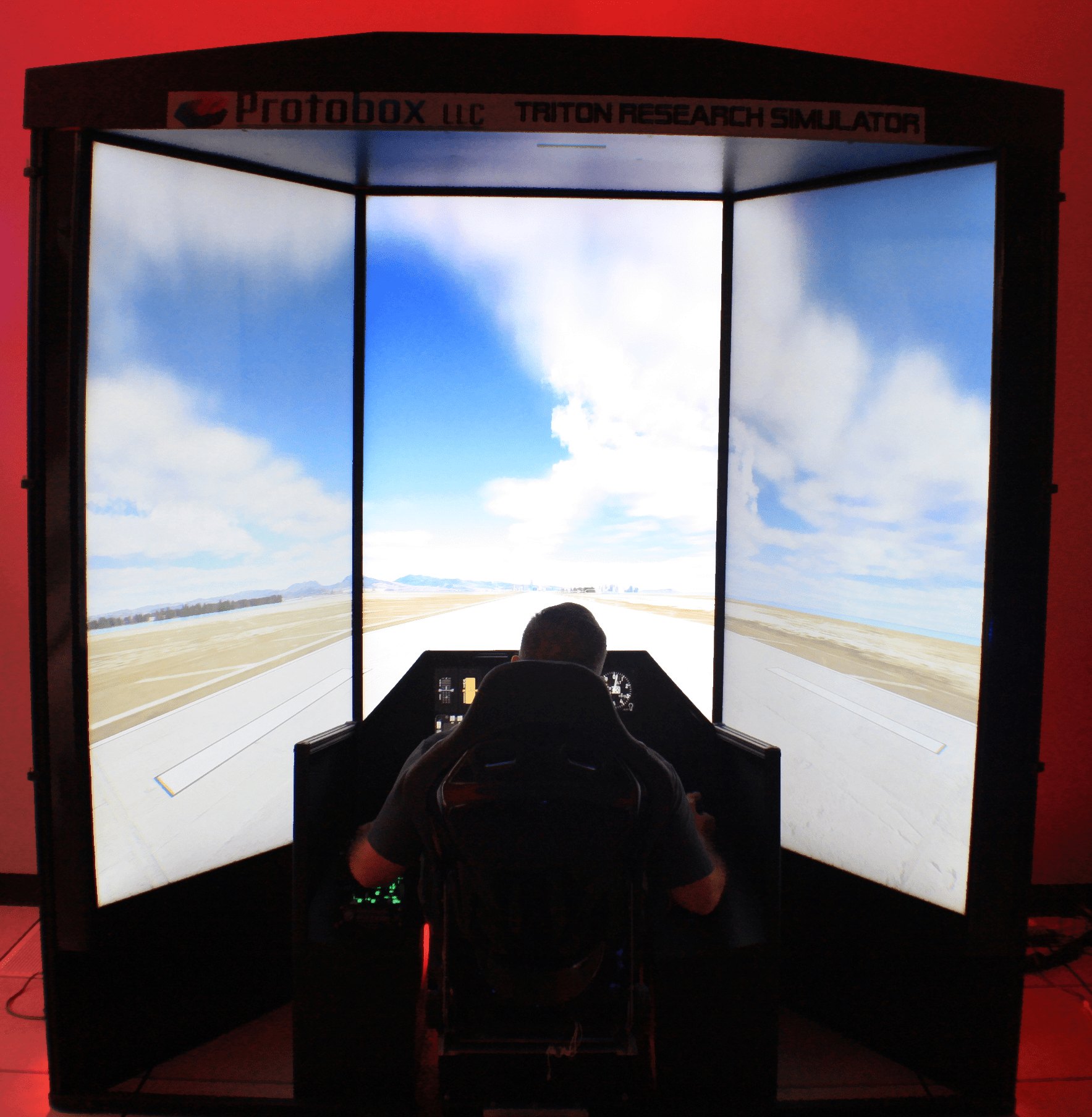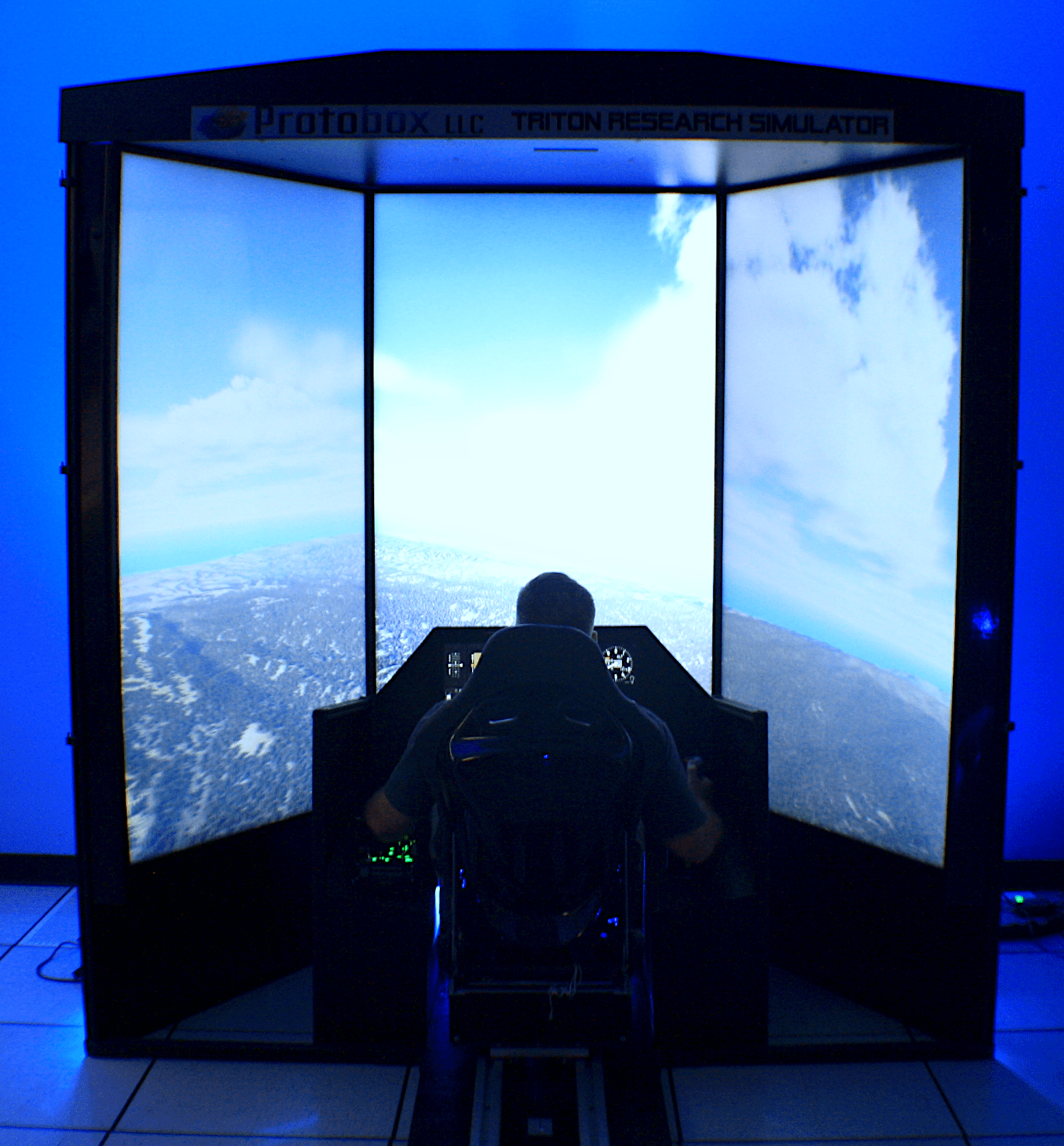 A low cost simulator comprised of a three channel out the window display provides a high-level of pilot immersion. Available in both UHD and HD visual fidelity options. Originally designed for aeroengineers and pilots to quickly test design models, this simulator maintains an immersive experience while also keeping a compact form factor.